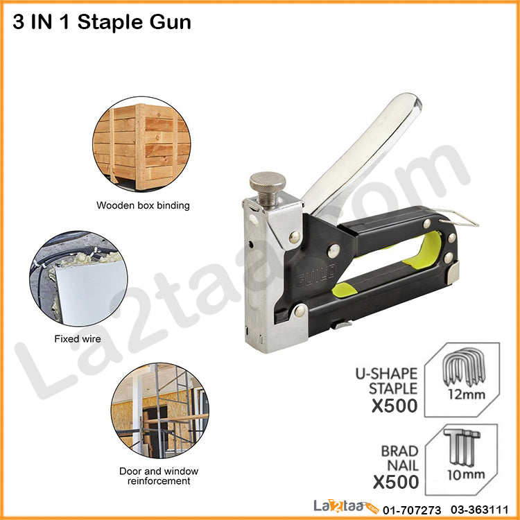 This Guild, hand-operated, 3-in-1 Staple Gun is ideal for general household fastening tasks. Three different types of fasteners can be used with this tool including nails, staples and u-shape staples, and these can be used in soft and medium wood.