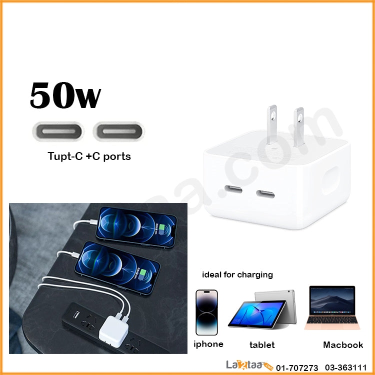 - The 50W Dual USB-C +C Ports Compact Power Adapter allows you to charge two devices at the same time, whether you’re at home,