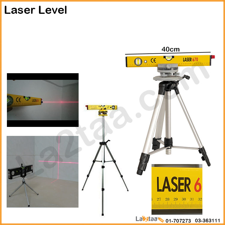 Straight laser level, length 40 cm, lower sole erect. 2 precision vials, one of which can be rotated ±90°. 670 nm laser source, class 2 giving the point. Maximum power 1 mW. Class 3 protection. Accuracy ±0.029° / ±0.5 mm/m.